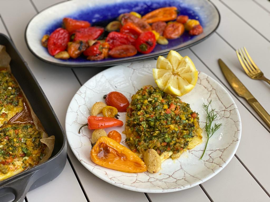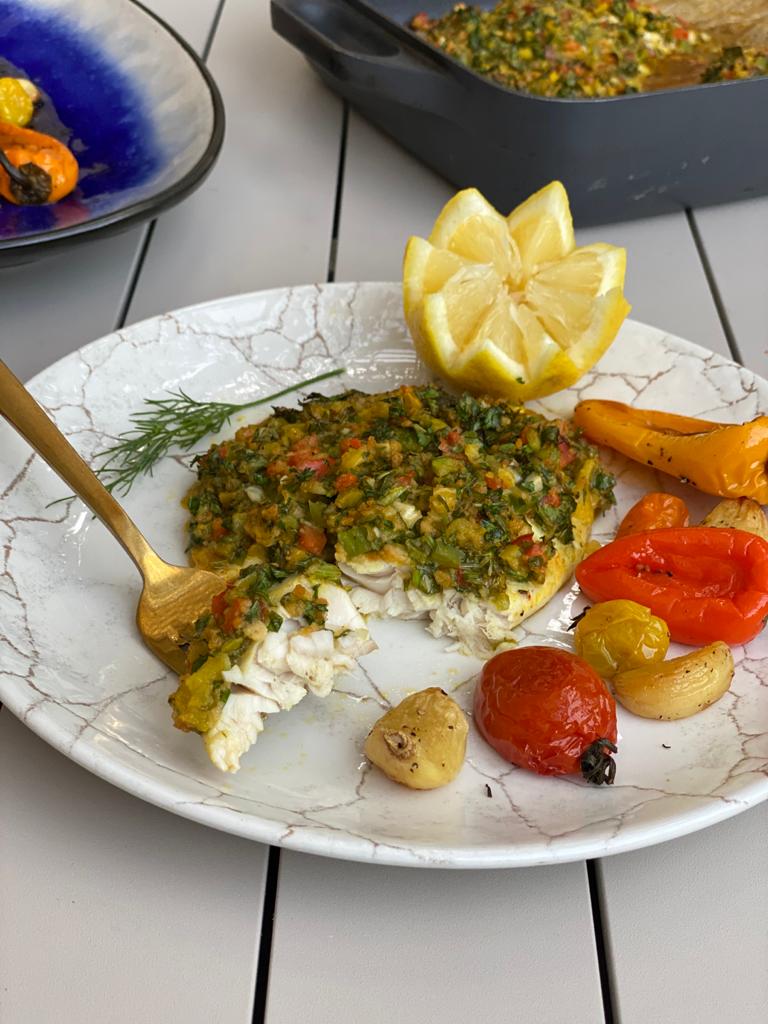 אחרי שערבבנו היטב את התיבול של השמן שהברשנו עם הפלפלים ועשבי התיבול מניחים על כל דג מלית.